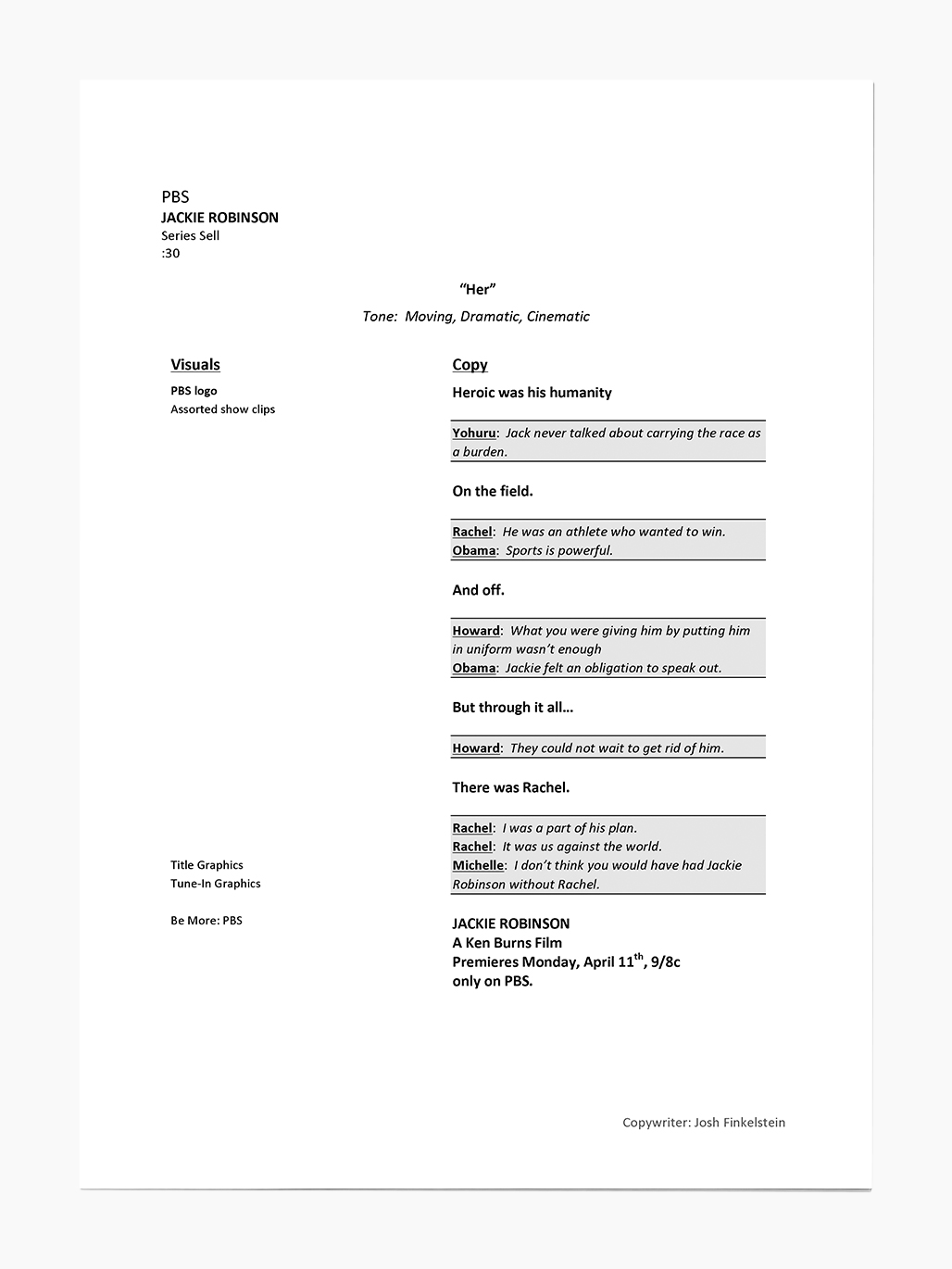 As one of a number of copywriters, I produced a number of scripts to be considered for a 30 second series sell, under the creative direction of Derrick Chamlee and John Ruppenthal. Our goal was to find something about this particular documentary that separated it from all the other Jackie Robinson films that have been produced.