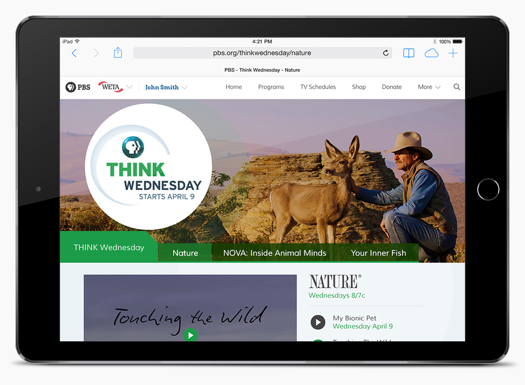Think Wednesday is a PBS programming block dedicated to popular science, history and nature-based documentaries. Every week featured new and upcoming shows and episodes. Our typical audience for these types of programs were curious and intellectual families. These shows usually garnered a 1.0-1.2 nielsen rating.